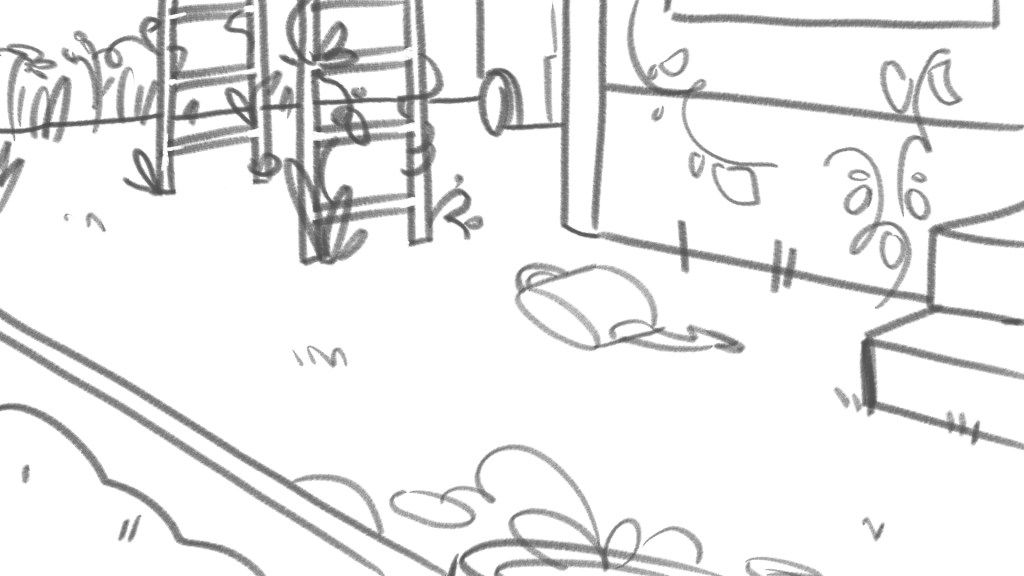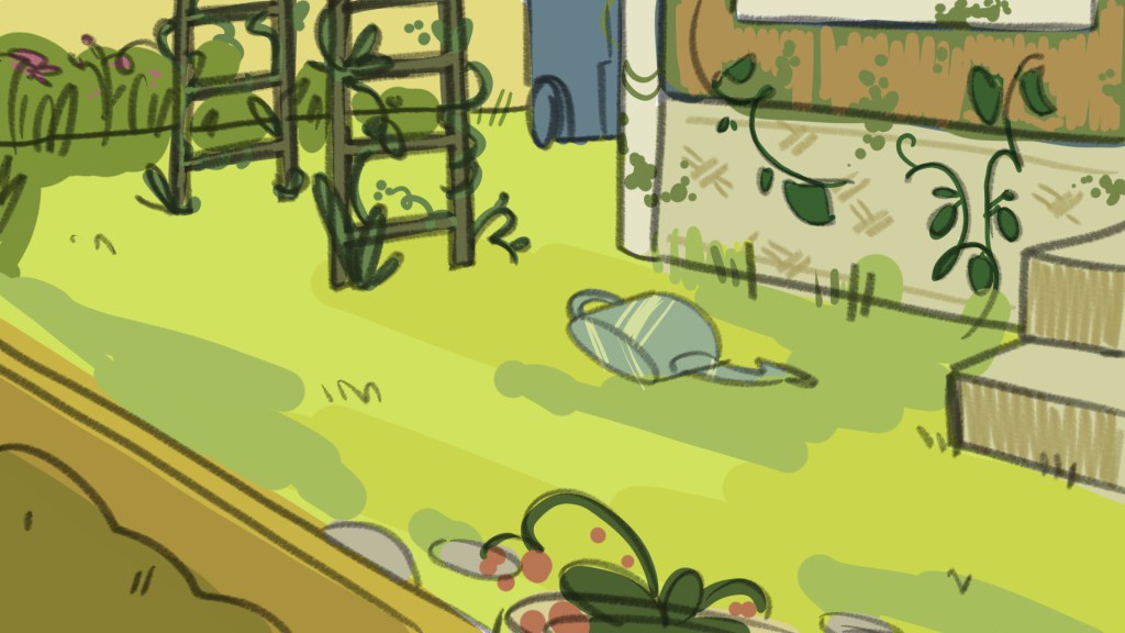 I continue to focus on rough animation and backgrounds. Below is a layout and colour study I sent to Denise to work on the background for shot#12. I decided to change the composition compared to what I planned in the animatic, moving the tomatoes to the left-hand side. I also no longer intend to animate the gardener walking away; I don’t think it’s entirely necessary, and it’s a lot of extra work.