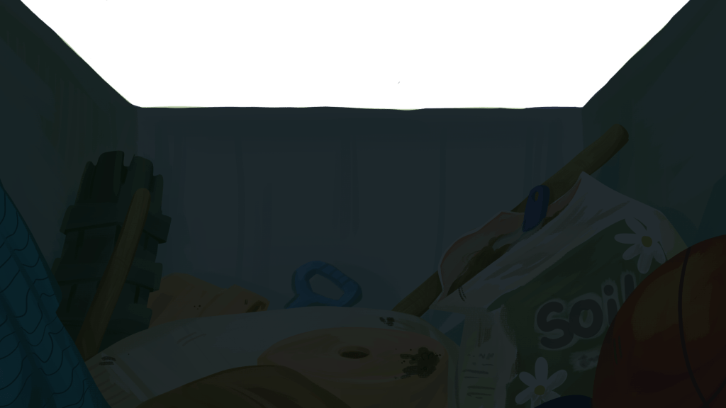 Shot#9 Background + Exploration. This shot has the bin open, so I worked on how the shadows and lighting would look. The bin is without its lid, since it will be animated.